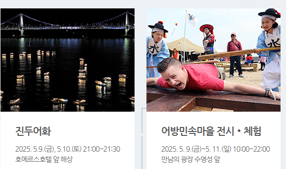 축제의 개막을 알리는 '뮤지컬 어방'은 전통 어업 이야기를 현대적인 뮤지컬로 재구성한 공연입니다. 특히 가족 단위 관람객들에게 큰 인기를 끌고 있어, 개막 첫날 일찍 자리를 잡는 것이 좋습니다.