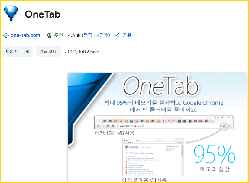 탭을 여러 개 열어두는 습관이 있다면 OneTab은 정말 필수 프로그램이라고 할 수 있습니다. 열어둔 모든 탭을 단 한 번의 클릭으로 리스트 형태로 변환해 메모리 사용량을 최대 95%까지 줄여주는 기능을 갖고 있어요.