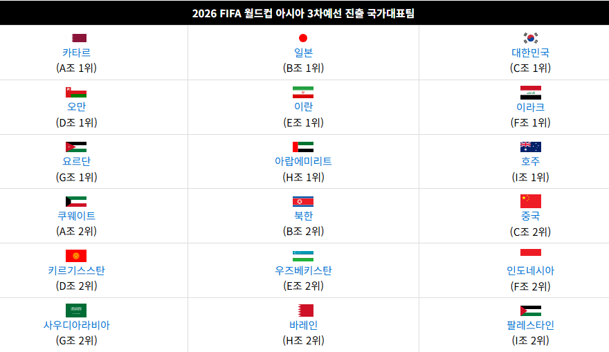 2025 월드컵 아시아 예선 순위(+조별 순위, 본선 확정국가)