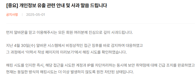 안녕하세요, 최근 디지털 보안 사고가 많이 일어나고 있는데요. 알바몬도 해킹 피해를 입어 개인정보 유출 사건이 발생했습니다. 이번 포스팅에서는 알바몬 해킹 사건 내용과 보상 대상자 확인 방법, 그리고 10만원 보상을 받을 수 있는 방법을 자세히 알려드리려고 합니다. 만약 알바몬을 이용하셨다면 꼭 확인해보세요! 알바몬 해킹 사건 개요2024년 4월 30일, 알바몬 시스템에 비정상적인 접근 징후가 감지되었습니다. 이력서 작성 페이지의 미리보기 기능에서 해킹 시도가 확인되었으며, 알바몬 측에서는 해당 접근을 시도한 계정과 IP를 즉시 차단하고 보안 취약점에 대한 긴급 조치를 완료했다고 합니다. 알바몬 바로가기 !! 하지만 이 과정에서 약 2만 440건의 임시저장된 이력서 정보가 유출되었어요. 유출된 정보에는 ..